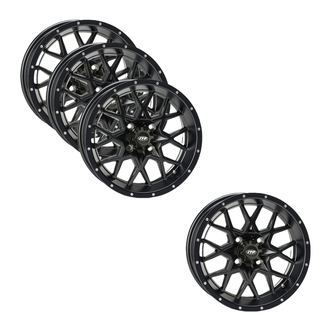 ITP Hurricane är den mest populära fälgmodellen i ITPs STORM serie. Klassisk mattsvart finish. Fälgen använder ITP Rock Armor teknolgi som gör att fälgen är extremt hållbar! Fälgpaketet innehåller: 4st 14x7 fälger med 5+2 offset